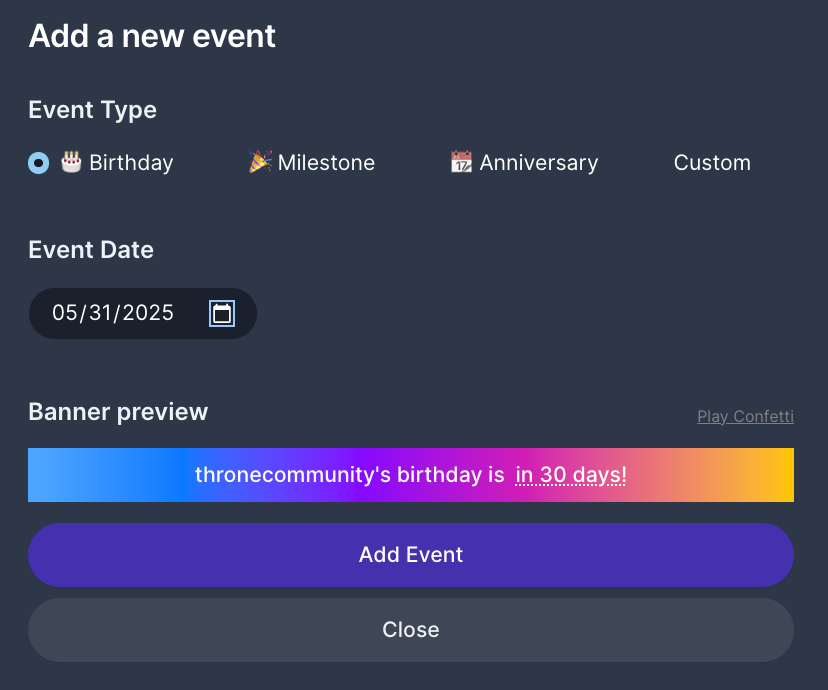 Whether it’s your birthday, a stream anniversary, or hitting a milestone, fans love celebrating with you. Enable events to: