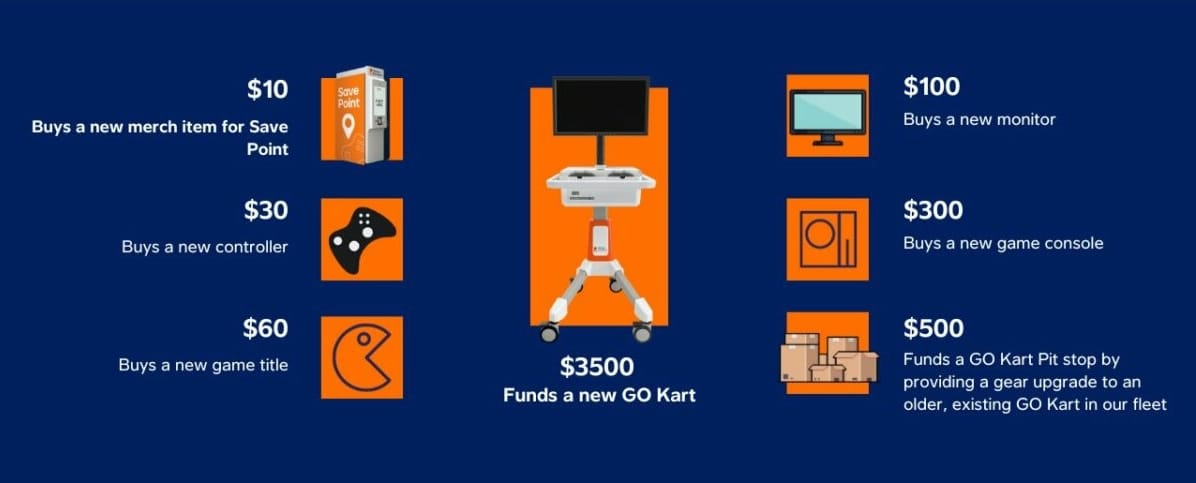 GO Karts (Gamers Outreach Karts) are portable video game stations designed to provide children in hospitals with access to fun and engaging games. Each kart comes equipped with a gaming console, monitor, and controllers, offering young patients the chance to experience the therapeutic benefits of play while undergoing treatment. These karts allow children who are bedridden or have limited mobility to immerse themselves in video games, reducing stress, fostering positive interactions, and helping them stay connected with friends and family during a challenging time. For these kids, a GO Kart is more than just a gaming station—it’s a lifeline to joy and comfort.